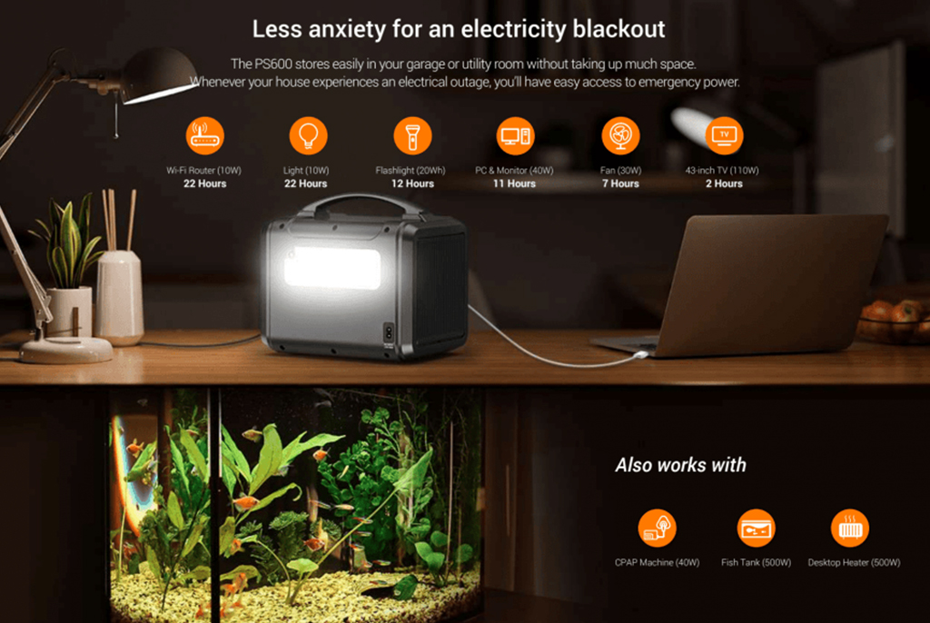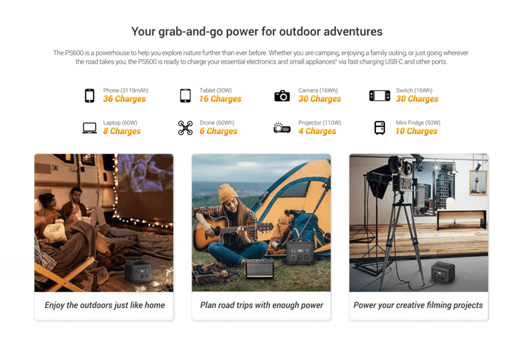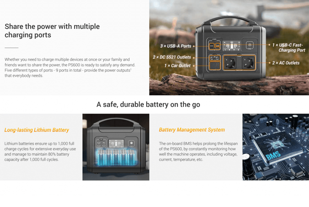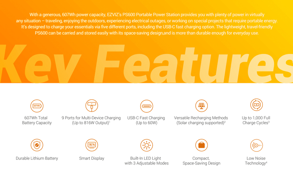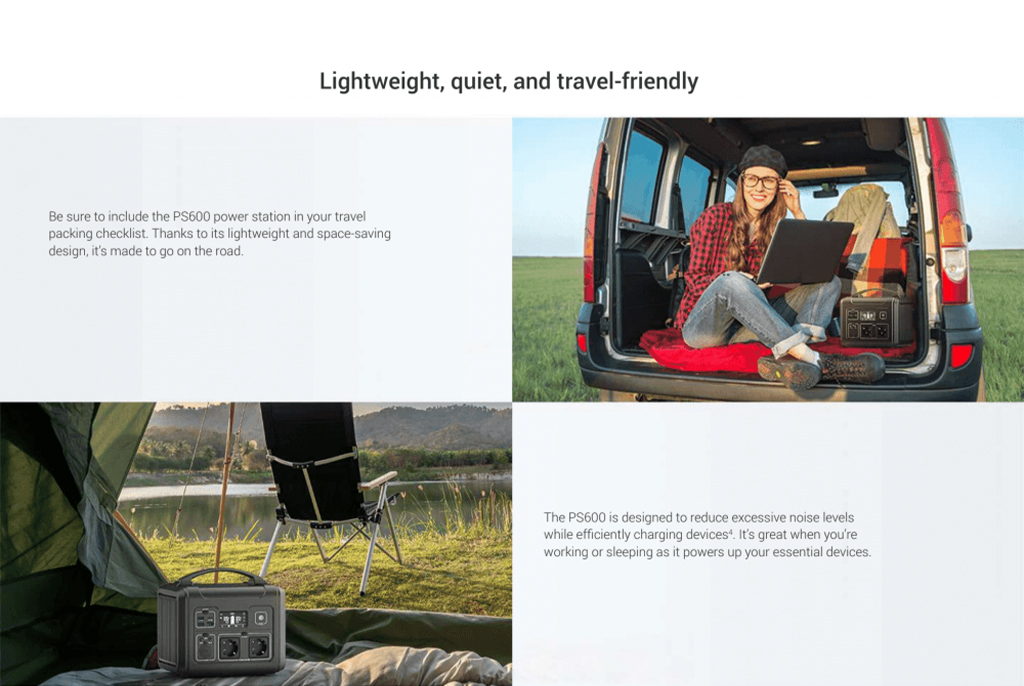 Introducing the PS600 Portable Power Station from EZVIZ – your reliable and versatilebpower companion for all your outdoor adventures. This compact and lightweight power bank packs a whopping 607Wh of power capacity, this power station is your reliable source of energy for any situation, whether you're on a camping trip, experiencing a blackout, or working on a special project. Equipped with a variety of power output sockets the PS600 is ready to power all of your adventures: Fitted with five types of outlet to connect all of your devices on the move.