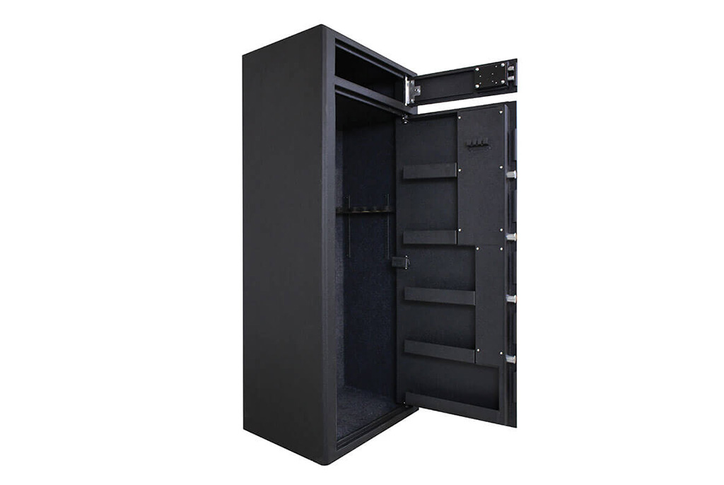The safe also includes a separate ammunition compartment, allowing ammunition to be stored securely and independently from firearms.